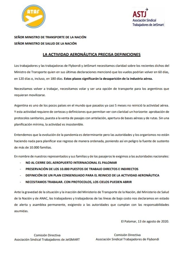 Los gremios aeronáuticos han expresado que tienen listos los protocolos sanitarios de la ANAC que permiten volver a volar en condiciones sanitarias seguras. “Es muy seguro a diferencia del transporte terrestre. Acá se toma la temperatura, los aviones tienen filtros que renuevan el aire y ya no se puede llevar equipaje de mano en la cabina, solo se puede despachar. Reclamamos una fecha concreta para el reinicio de la actividad aerocomercial. Dicen que en 60, 80 días se vuelve. Una empresa privada no es sustentable en el tiempo sin facturación”, expresó el sindicalista de Flybondi, Manuel Trim. El sindicato de trabajadores recalcó que “la actividad aerocomercial es planificada. Hay que vender tickets con anticipación, hay que solicitar rutas. Les pedimos al Ministerio de Transporte, de Salud, a ANAC que nos den una respuesta”.
