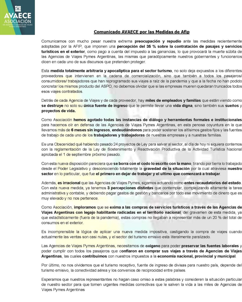 La Asociación Civil de Agentes y Agencias de Viajes Pymes Argentinas (AVAECE) ha difindido un comunicado en el que ha manifestado su extrema preocupación y repudio ante las medidas adoptadas por la AFIP, que imponen una percepción del 35% sobre la contratación de pasajes y servicios turísticos en el exterior, como pago a cuenta del impuesto a las ganancias. El organismo sostiene que ello provocará la muerte súbita del sector y destruirá la fuente de trabajo de empleados y familias. “Esta medida totalmente arbitraria y apocalíptica para el sector turístico no solo deja expuestos a los diferentes proveedores que intervienen en la cadena de comercialización, sino también a los pasajeros, consumidores y trabajadores que reprogramaron sus viajes a raíz de la pandemia y que a la fecha no pudieron concretarlos. Si las empresas mueren, quedarán truncados todos esos viajes contratados”, expresaron desde la asociación.