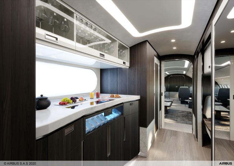 The Airbus ACJ220 TwoTwenty sits midway between large and small corporate jets, offering amenities like private rooms, showers, lounges, reclining seats, and more. Customers can choose from a variety of high-tech features, including fast connectivity and dimming windows, similar to those offered on the Boeing Dreamliner.