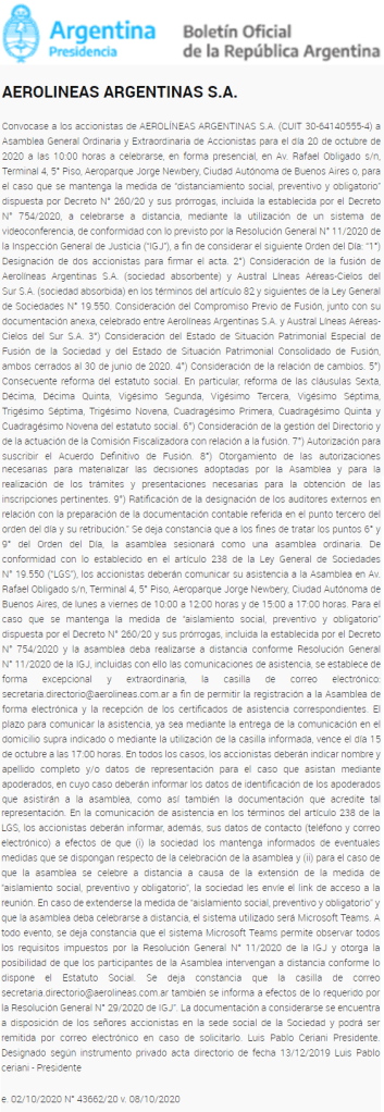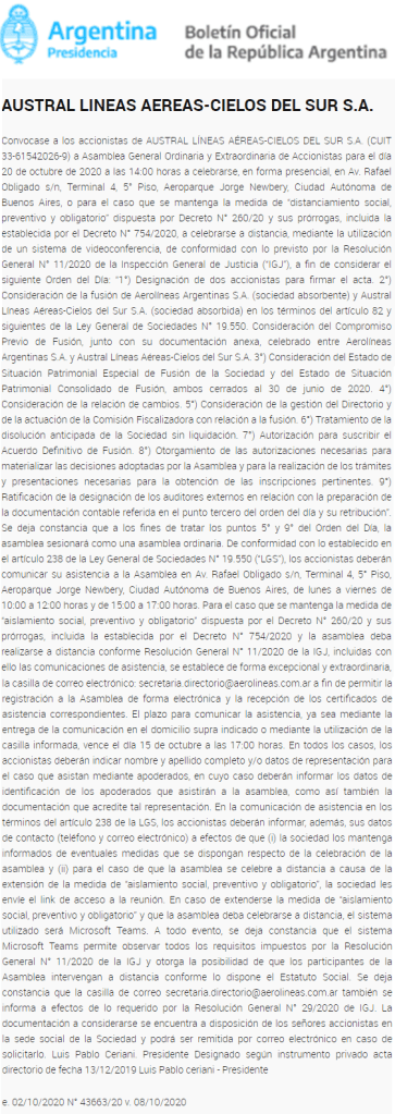 The Government of the Argentine Republic has published this 08/10 in the Official Gazette, the call for the Meeting of Shareholders of the companies Aerolíneas Argentinas and Austral Líneas Aéreas in Ordinary and Extraordinary General Assembly of Shareholders for October 20, 2020 at 10:00 am for treatment of the synergy of the airlines.
