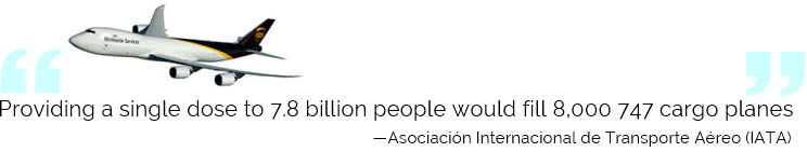 ¿Qué tan grande es el desafío? Según la Asociación Internacional de Transporte Aéreo (IATA), expresó: «proporcionar una dosis única a 7.800 millones de personas llenaría 8.000 747 aviones de carga». Mientras tanto, múltiples laboratorios representarán una batalla contrarreloj para coordinar los procesos con las aerolíneas para llegar a cada rincón del planeta, pero varios laboratorios en otros países podrán acelerar los procesos de inmunización de la población al fabricar los antivirus para reducir los tiempos y procesos.