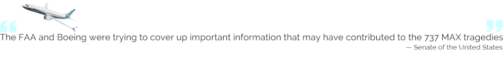 Un nuevo informe del Senado de Estados Unidos determina las acusaciones contra la Federal Aviation Administration (FAA) y The Boeing Company contra la manipularon de pruebas del Boeing 737 MAX durante la recertificación. Es una de las muchas acusaciones en un nuevo y condenante informe del Capitol Hill. La compañía Boeing y la Administración Federal de Aviación trabajaron de manera conjunta para manipular las pruebas de recertificación de la línea del modelo Boeing 737 MAX después de dos accidentes aéreos ocurridos en 10/2018 y 03/2019, según un nuevo informe de la Comisión de Transporte del Senado de Estados Unidos. Según el documento del Senado, Boeing ha entrenado inapropiadamente a algunos pilotos de pruebas de la FAA para alcanzar un resultado deseado durante las pruebas de recertificación, y algunos incluso se realizaron en simuladores que no estaban equipados para volver a crear las mismas condiciones que los accidentes. Al hacer esto, los autores del informe del Senado dicen que «la FAA y Boeing estaban tratando de encubrir información importante que pudo haber contribuido a las tragedias del 737 MAX». La FAA también está acusada de tomar represalias contra los denunciantes, posiblemente obstruyendo la investigación de la Oficina del Inspector General sobre los accidentes.