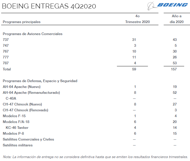 The Boeing Company announced this 01/12 important program deliveries in its commercial and defense operations for the fourth quarter of 2020. «Through the global pandemic, we are taking significant steps to adapt to our new market, transform our business and offer our commercial, defense, space and service customers in 2020. The resumption of 737 MAX deliveries in December was a key milestone as we strengthen safety and quality across our company. We also continue extensive inspections of our 787 aircraft to ensure that they meet our highest quality standards prior to delivery.As we limit our 787 deliveries for the quarter, these comprehensive inspections represent our focus on safety, quality and transparency, and we are confident that we are taking the right the right steps for our clients and for the long-term health of the 787 program. As we continue to navigate through the pandemic, we are working closely with our global clients and monitoring the slow recovery of international traffic to align supply with market demand across all of our large body programs. In 2021, we will continue to take the right steps to improve our safety culture, preserve liquidity, and transform our business for the future», said Greg Smith, Executive Vice President of Business Operations for Boeing and Chief Financial Officer.