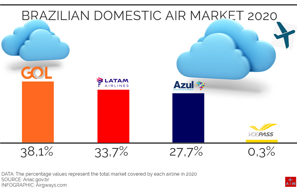 En los últimos cuatro años, GOL Linhas Aéreas continuó liderando el mercado brasileño con un 38,1%, seguida por Latam Airlines Brasil con una cuota del 33,7% (2020), Azul Linhas Aéreas en tercer lugar ha reducido su distancia con respecto a Latam Airlines Brasil, acercándose con una participación del 23,7% (2019) al 27,7% (2020). El cuarto lugar fue para VoePass con una cuota de mercado del 0.3%.
