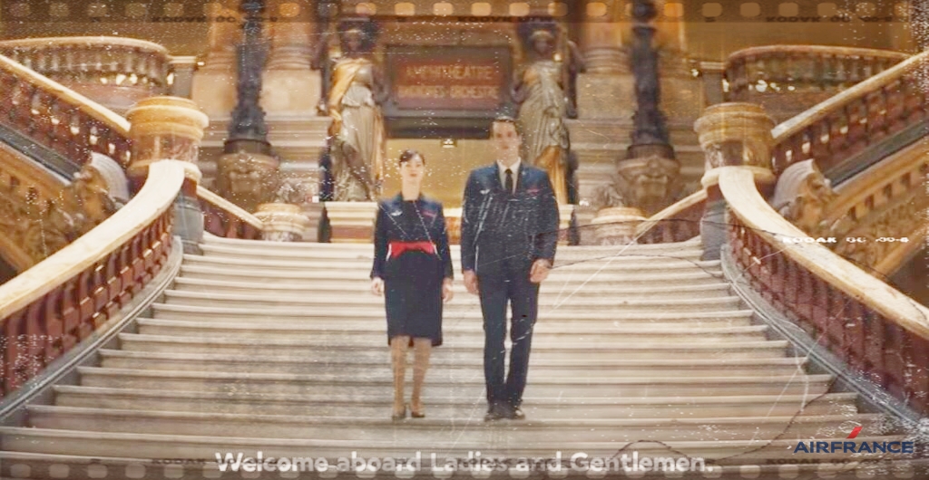 Deux PNC communiquent les consignes de sécurité à bord à des clients de tous horizons, voyageant ensemble d’un lieu emblématique à un autre, tous lieux qui évoquent le meilleur de la France, au son de mélodies vivantes inspirées de comédies musicales. En un instant, les voyageurs sont transportés des marches de l’Opéra Garnier aux jardins du château de Versailles, ou de la Côte d’Azur ensoleillée au légendaire Hôtel Martinez à Cannes. La promenade se poursuit à travers les vignobles de Provence, devant les musées, un défilé de mode, une terrasse de café typiquement française et le long des berges de la Seine avec ses célèbres bouquinistes. Une collection de lieux fascinants à découvrir ou à redécouvrir. Le salon de la sécurité culmine au sommet de l’emblématique Tour Eiffel en flash, où un équipage d’Air France accueille les clients de l’entreprise.