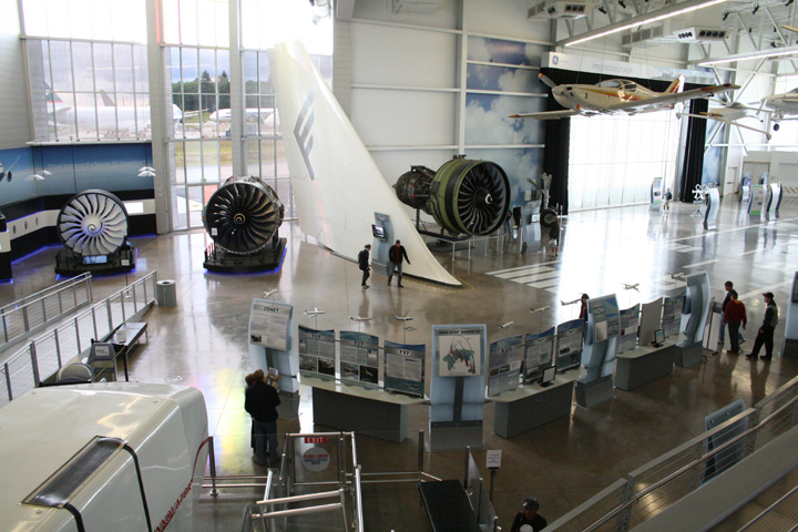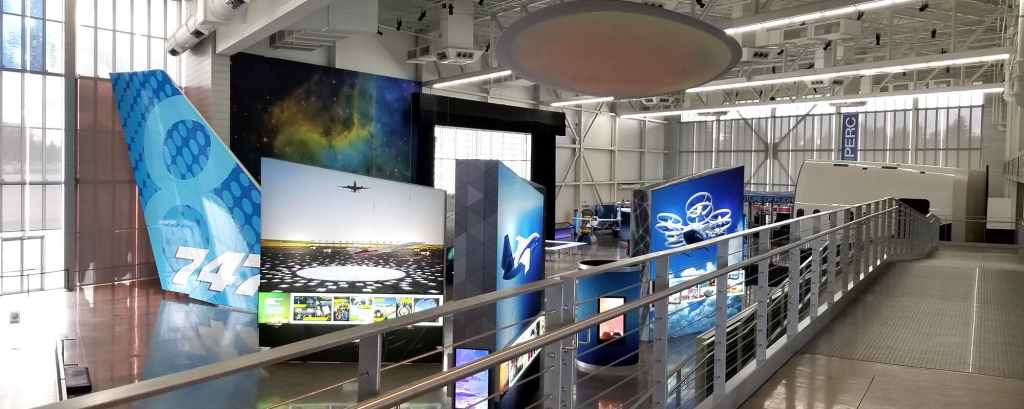 Una entrada da a los visitantes acceso a la galería de exposiciones y sky deck al aire libre, con vistas panorámicas de Paine Field, la planta de ensamblaje en Everett y las cascadas del norte. Una gran parte de la galería está dedicada a aviones autónomos, diseños que pueden transportar de uno a cuatro pasajeros. Las nuevas exposiciones incluyen un espacio de práctica de pilotaje de drones y una pantalla circular gigante suspendida del techo que representa un vuelo simulado de la Tierra a Marte.