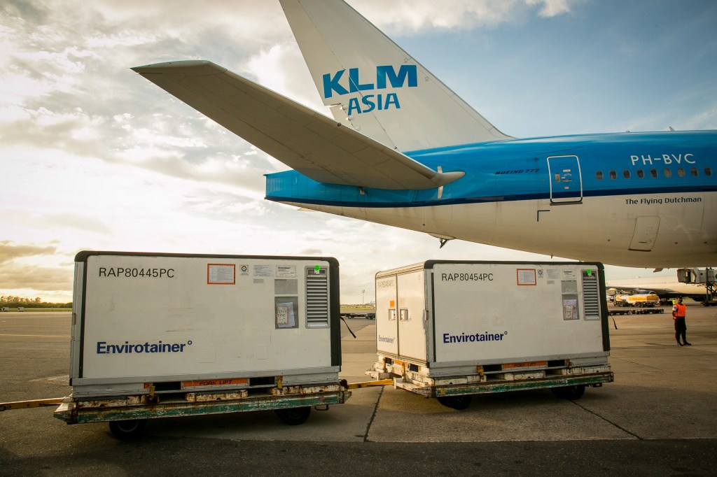 The vaccines traveled in two temperature-controlled Envirotainers RAP E1 containers, with a temperature range of +2 to + 8 ° C. During the time the vaccines were in transit in Amsterdam, they were stored in the climate-controlled facilities of Air France KLM Martinair Cargo at Schiphol Airport, which is specially prepared to receive such sensitive products. The electrical containers are connected to the current within these facilities, where operation and temperature monitoring is carried out 24 hours a day.