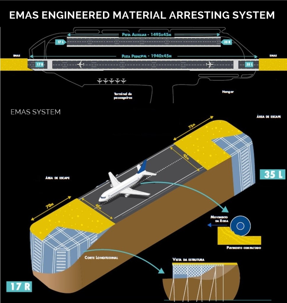 Called Modified Materials Arrest System (EMAS) an engineered materials system for the arrest of aircraft. New technology lengthens runways at space-constrained airports like Congonhas. That is, if the plane exceeds the runway limit it falls on the ground made to disintegrate, which would keep the aircraft «trapped» in the concrete at the end of the runway. The two structures will be supported by beams and pillars capable of supporting aircraft and vehicles.