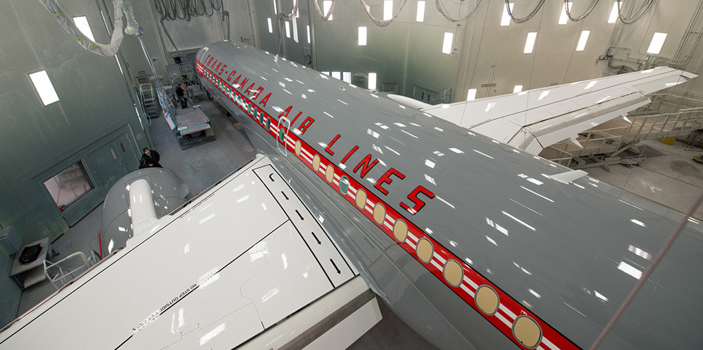 Airbus Group has opened its paint hangar doors in Mirabel, Canada to show at a glance inside the Paint FAL, the latest Airbus A220-300 regional aircraft for Air Canada. Instead of the usual black and white livery with its «raccoon mask» that Air Canada now sports throughout its fleet, the airline has chosen to nod to its history, revealing its special Trans-Canada Air Lines design.