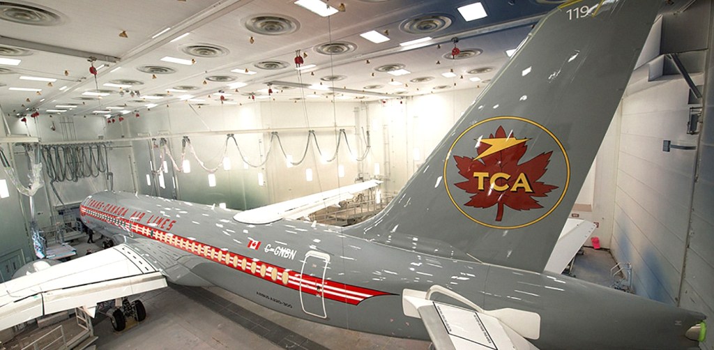 Airbus Group ha abierto sus puertas de hangar de pintura en Mirabel, Canadá para mostrar de un vistazo dentro de la FAL de pintura, el último avión regional Airbus A220-300 para Air Canada. En lugar de la habitual librea en blanco y negro con su «máscara de mapache» que Air Canada ahora luce en toda su flota, la aerolínea ha optado por hacer un guiño a su historia, revelando su diseño especial de Trans-Canada Air Lines.
