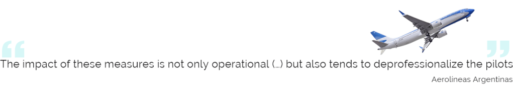 Aerolíneas Argentinas ha denunciado al gremio de la Asociación de Pilotos de Líneas Aéreas (APLA) que nuclea a los pilotos por negarse a entrenar en simuladores en medio de un conflicto por las vacunas. La razón de la postura del sindicato radica en que no quieren practicar en simulador por temor al contagio y exigen ser vacunados. Ante este reclamo de los pilotos, la compañía corre riesgos de no certificar aptitudes para las tripulaciones lo que podría ocasionar dificultades para el organigrama de vuelos. Desde la compañía argumenten que se trata de una medida de fuerza encubierta.