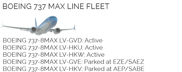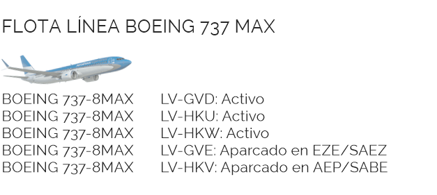 The airline owns three Boeing 737-8 MAX aircraft: LV-HKU, LV-GVD and LV-HKW. Currently, the MAX fleet will fly on cabotage routes in Argentina, while the projection for the future is to reincorporate them to regional routes in Latin America and the Caribbean. Initially they are doing only domestic routes. The 737 MAX aircraft make trips to and from airports with a greater infrastructure such as Córdoba, Mendoza, Bariloche, Rosario, since they have a scale of technical assistance required for this purpose. The total fleet of Aerolíneas Argentinas comprises five Beonig 737-8 MAXs (5) in its fleet. The remaining planes that are still parked are one at Jorge Newbery Airport and the other at Ezeiza Airport.