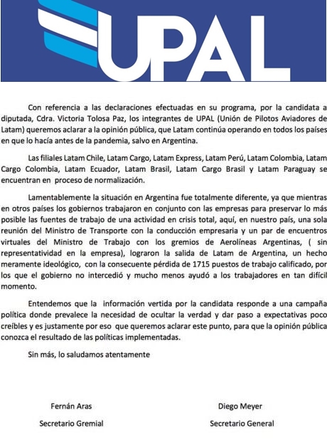 Desde la Unión de Pilotos Aviadores de Latam Argentina (UPAL) emitieron un comunicado contra los dichos de la precandidata y sus declaraciones. Allí explican que todas las filiales continúan operando con normalidad, excepto en Argentina, que es la única jurisdicción en la que cerraron sus puertas. Fernán Aras, Secretario Gremial de UPAL, exprsó que la compañía no se fue sola sino porque el Gobierno le puso todas las trabas posibles y le dio la espalda cuando presentaron un plan para sobreponerse a la quiebra. Al comenzar la pandemia, el holding empezó a realizar ajustes como la reducción de los salarios, licencias sin goce de sueldo y despidos. En todas sus filiales llevo a cabo este accionar, menos en la Argentina porque no se lo permitieron. “Tolosa Paz ignora las más de 1.700 familias que se quedaron sin trabajo. Livianamente le echa toda la culpa a la pandemia y dice que no hay que preocuparse. Pero ellos empezaron hace años con Cristina Fernández y los hangares, y siguieron en este Gobierno, con medidas restrictivas a la compañía. No quieren que esté otro que no sea Aerolíneas Argentinas”, detalló el sindicalista de pilotos de aviadores.