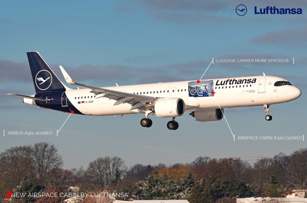 La nueva cabina Airspace de Lufthansa Airlines ofrecerá más comodidad a los pasajeros en varios aspectos: ofrece mucho más espacio de almacenamiento para el equipaje, permitiendo a los pasajeros almacenar un 40% más de equipaje que la cabina actual del A321NEO de la aerolínea. Algunos cambios están enfocados en el área de entrada de la aeronave para que sea más lumínica y amigable. La iluminación inteligente se adapta a la hora del día para ayudar a los biorritmos de los pasajeros. En términos de iluminación, la aeronave está equipada con luces de diferentes colores que van desde un rojo cálido hasta un azul frío, permitiendo cambiar a lo largo del vuelo para adaptarse al biorritmo de un pasajero dependiendo del horario biológico de los pasajeros. La cabina Airspace también ha incorporado mejoras en la comodidad de los pasajeros referentes a los asientos permitiendo más espacio para sus hombros si están sentados en un asiento de ventana en una configuración 3X3.