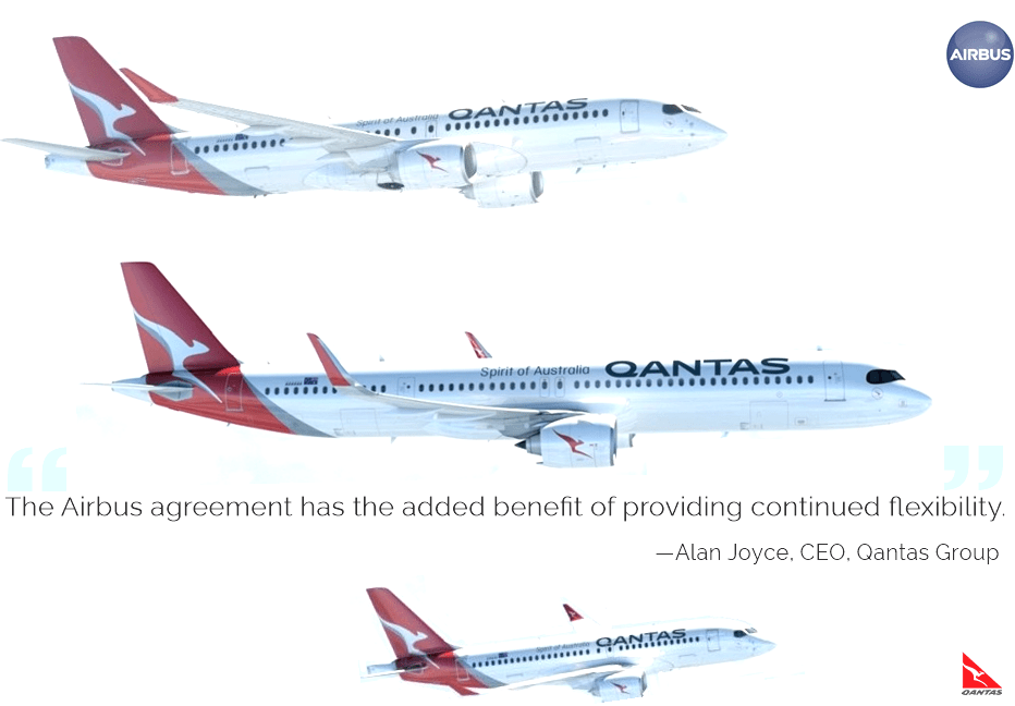 El nuevo pedido ha permitido dar un cambio de cliente decantándose por el constructor europeo, quebrando así el dominio de The Boeing Company en la flota de Qantas Group. El acuerdo se suma al acuerdo existente de Jetstar Airways con Airbus por más de cien aviones de la familia A320NEO (100). En este nuevo acuerdo se incluye la combinación de estos dos pedidos para permitir que el grupo utilice un total de 299 aviones del fabricante europeo, como se requiere durante la próxima década para Qantas Airways, QantasLink y Jetstar Airways. Alan Joyce dijo que presentará un nuevo interior y una nueva experiencia de vuelo una vez que comiencen a entregarse los nuevos aviones. Una vez finalizado el acuerdo, representará el pedido de aviones más grande en la historia de la aviación australiana.