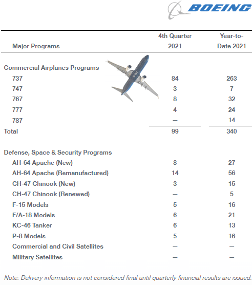 The Boeing Company has announced this 11/01 important deliveries of programs in its commercial and defense operations for the fourth quarter of 2021. The company will provide detailed fourth quarter financial results on January 26, 2022. The main program deliveries during the fourth quarter were as follows: