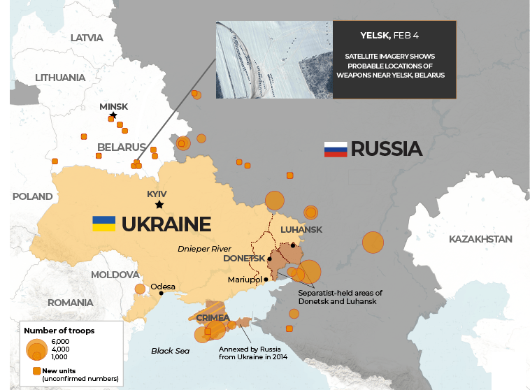 Se teme que si Rusia intenta invadir Ucrania, los ejercicios pongan al ejército ruso cerca de la capital ucraniana, Kiev, lo que facilitará un ataque a la ciudad. Rusia dice que sus tropas regresarán a sus bases permanentes después de que terminen los ejercicios. Ucrania ha lanzado sus propios ejercicios militares de diez días, aunque los funcionarios han dado pocos detalles. Moscú dice que no puede aceptar que Ucrania, una ex república soviética con profundos lazos sociales y culturales con Rusia, pueda algún día unirse a la alianza de defensa occidental OTAN y ha exigido que esto se descarte. Rusia ha estado respaldando una sangrienta rebelión armada en la región oriental de Donbas en Ucrania desde 2014. Unas 14.000 personas, entre ellas muchos civiles, han muerto en los combates desde entonces.