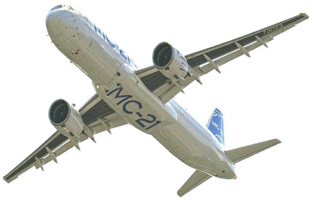 МС-21 первый среднемагистральный самолет Российской Федерации. Церемония запуска самолета состоялась в июне 2016 года в Иркутске. Первый полет МС-21 с американскими двигателями PW1400 совершил 28 мая 2017 года. Первый полет с российскими двигателями ПД-14 совершил в декабре 2020 года.