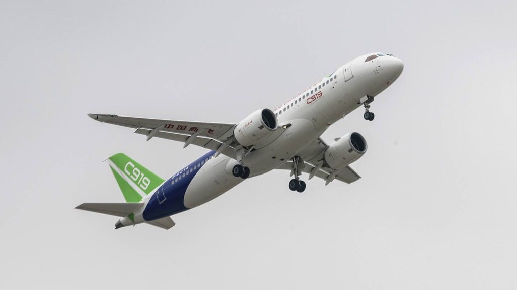 La Commercial Aircraft Corporation of China, Ltd. (COMAC) comenzó a desarrollar el C919 en 2008, que tiene un alcance de hasta 5.555 kilómetros y hasta 168 asientos. El 16 de Mayo de 2022, su primer avión numerado B-001J completó con éxito los vuelos de prueba.