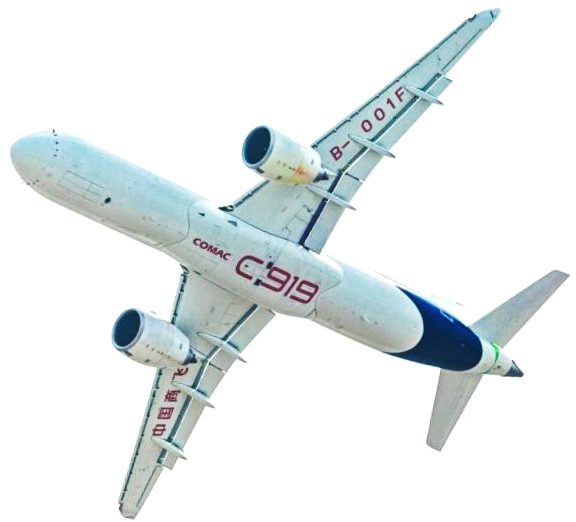 中國商用飛機有限責任公司(COMAC)於 2008 年開始研製 C919,其航程可達 5555 公里,最多可容納 168 個座位。 2022年5月16日,首架B-001J飛機順利完成試飛。