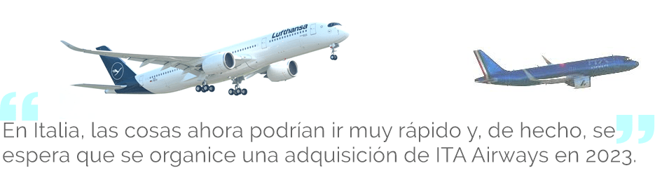 Lufthansa, que ha estado trabajando durante años en una adquisición de Alitalia y luego la sucesora ITA Airways ha fracasado en sus intentos. Ahora está surgiendo un acuerdo en el que Lufthansa Group junto con el ferrocarril italiano Ferrovie dello Stato Italiane, se harían cargo de la mayoría accionaria de ITA Airways.