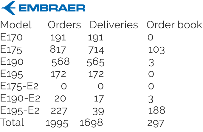 While the E175 backlog has shrunk, Embraer has almost made up for these losses with new orders for the E195-E2. Total orders for the E2-Jet correspond to 247 aircraft, twenty of them for the E190-E2. Embraer may expand on these figures soon, when Royal Jordanian signs the firm purchase agreement for 10 E2s whose Memorandum of Understanding was announced in October 2022.