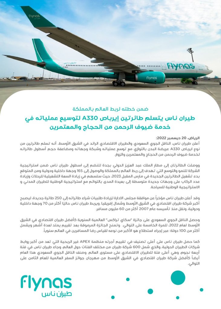 La aerolínea saudí de bajo costo flynas ha incorporado dos Airbus A330-300 (2) de fuselaje ancho a su flota, para conectar mejor a Arabia Saudita. El 20 de Diciembre de 2022, la aerolínea de bajo coste de Oriente Medio anunció que había introducido los dos aviones Airbus A330-300 de fuselaje ancho en su flota, para ayudar al transportista a expandir su capacidad para el siempre ocupado período de viaje del Hajj. Las aeronaves introducidas Airbus A330-300 registrados como HZ-NE22 y HZ-NE24, operaba anteriormente para Turkish Airlines.