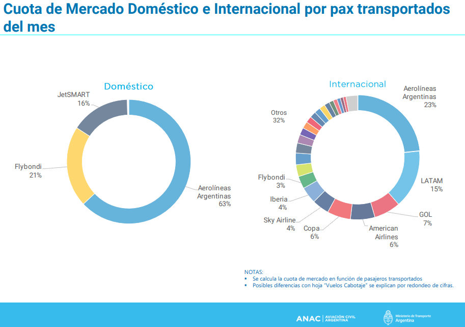The authority of the Argentine National Aviation Agency (ANAC) has developed the annual statistics for 2022 corresponding to the domestic market in Argentina. The market share of domestic flights is widely led by Aerolíneas Argentinas with 63%, while Flybondi has 21% and JetSMART Airlines Argentina has a 16% share in domestic flights.