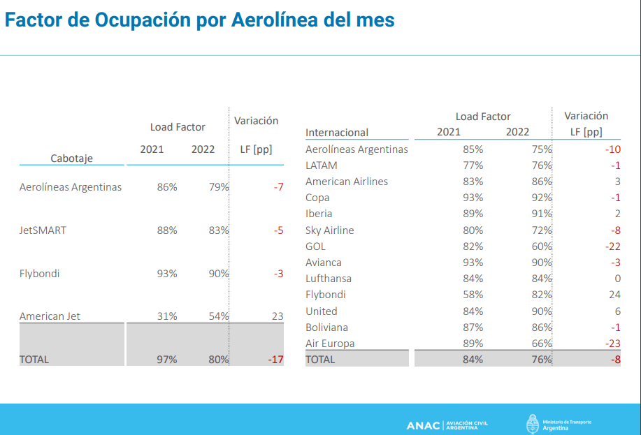 En movimiento del mercado respecto a la pre-pandemia indica que ha habido un avance de Aerolíneas Argentinas en un 2% después de la adquisición de Austral Líneas Aéreas. Flybondi paso de tener el 9% del mercado a ocupar el 21%. JetSMART Argentina de un 7% a un 16%. En referencia a los índices de factor de ocupación, Flybondi lidera con un 90%, segunda JetSMART con 83% y tercera la Aerolíneas Argentinas con un 79%, lo que representa un promedio a Diciembre 2022 de un 80% retrocediendo un 17% por debajo con un 97% interanual 12/2021. Con respecto a puntualidad, la ANAC no ha estado realizando informes trimestrales.
