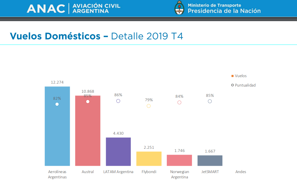 Market movement compared to the pre-pandemic indicates that there has been an advance of Aerolíneas Argentinas by 2% after the acquisition of Austral Líneas Aéreas. Flybondi went from having 9% of the market to occupying 21%. JetSMART Argentina from 7% to 16%. In reference to the load factor indices, Flybondi leads with 90%, JetSMART second with 83% and Aerolíneas Argentinas third with 79%, which represents an average of 80% as of December 2022, falling back 17% below. with 97% year-on-year 12/2021. Regarding punctuality, ANAC has not been making quarterly reports.