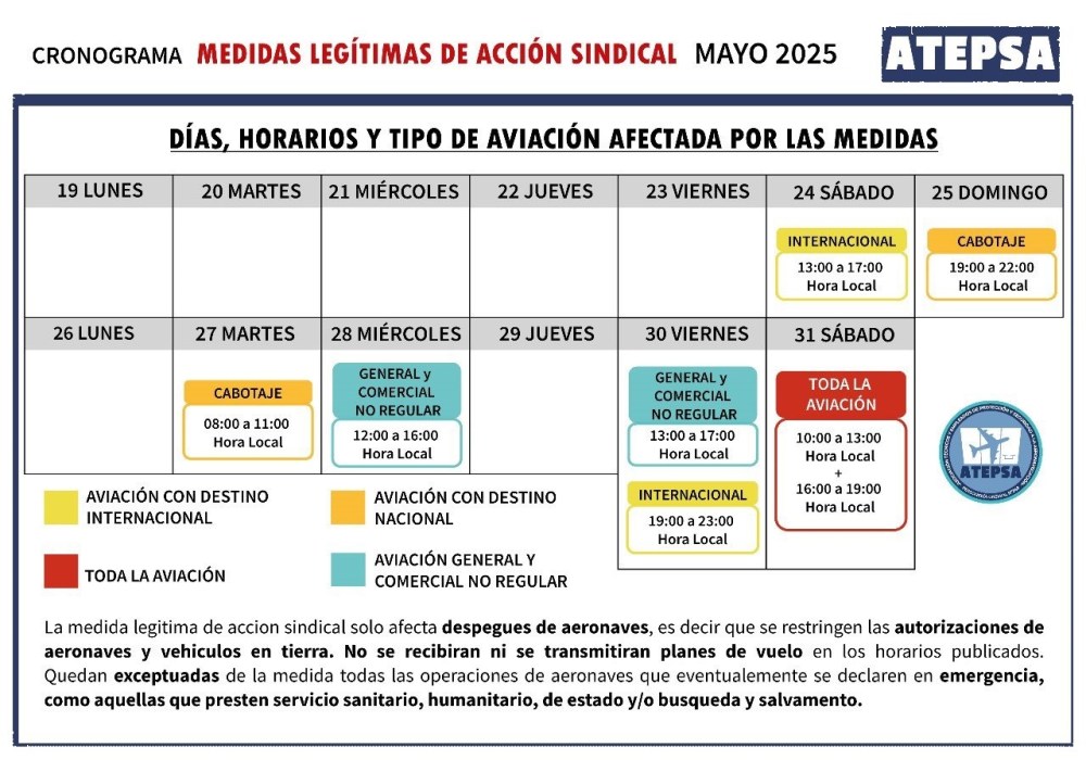 El gremio de controladores aéreos de Argentina nucleados en ATEPSA (Asociación Técnicos y Empleados de Protección y Seguridad a la Aeronavegación), anunció un plan de medidas de fuerza para la última semana del mes de mayo, en respuesta a la falta de avances en las negociaciones salariales. El cronograma de paros abarca seis días, con interrupciones de servicios entre 3 y 4 horas por jornada.