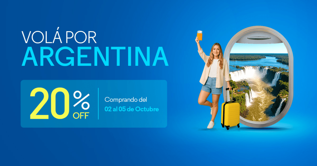 Aerolíneas Argentinas anuncia una promoción especial a partir del Jueves 2 de Octubre y hasta el Domingo 5 de Octubre de 2025, los pasajeros podrán acceder a un 20% de descuento en todos los vuelos dentro de Argentina, sin restricciones de fecha de viaje. El beneficio estará disponible a través de la web oficial, la app de la compañía y en agencias de viaje, y se aplicará sobre las tarifas vigentes al momento de la compra. Combinada con los planes de cuotas vigentes, esta promoción es la oportunidad perfecta para organizar tus próximas vacaciones.