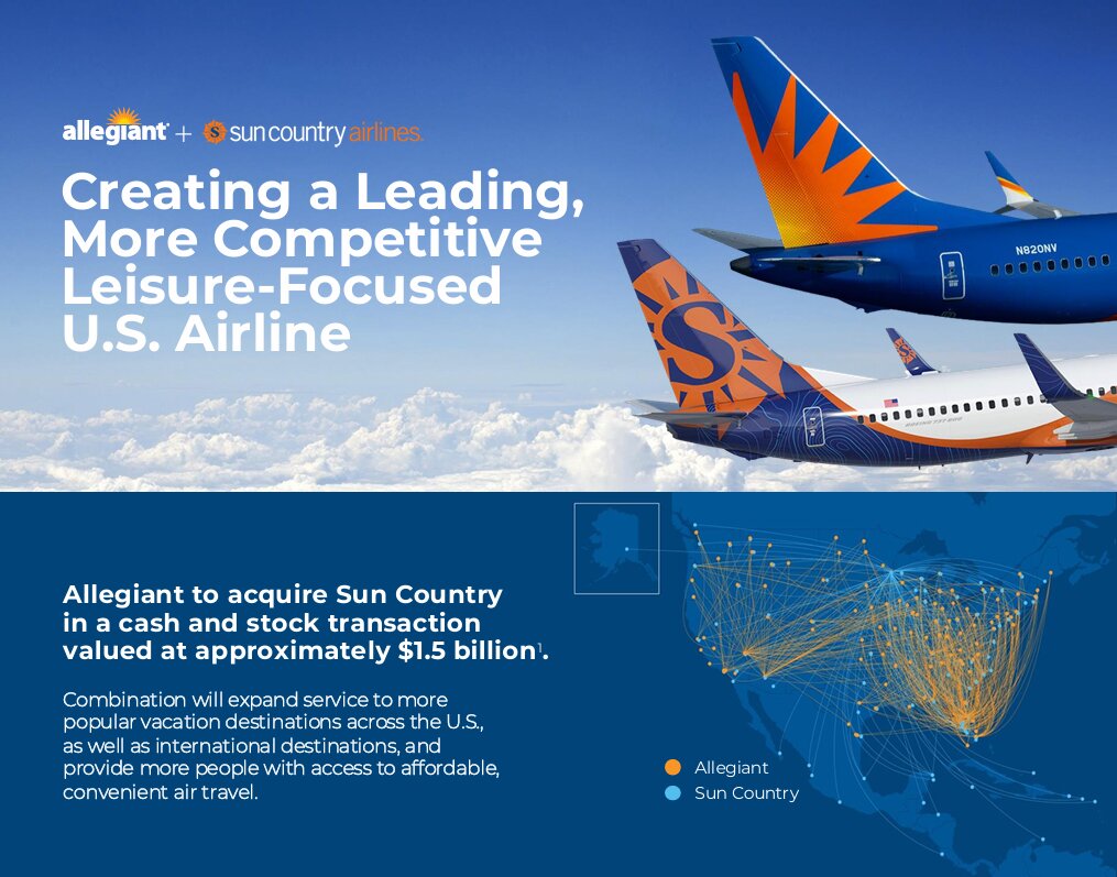 Allegiant Airlines y Sun Country están bien posicionados para crear uno de los modelos de aerolíneas más adaptables y resilientes del sector, con la capacidad de responder rápidamente a las condiciones cambiantes del mercado, la demanda de los viajeros y las necesidades de socios chárter y de carga. La combinación de dos transportistas de ocio financieramente sólidos en Estados Unidos generará beneficios para clientes, comunidades, empleados y socios al mejorar la estabilidad, ampliar las oportunidades y permitir la inversión e innovación continuas. Un compromiso compartido con viajes de ocio asequibles para nuestros 22 millones de pasajeros anuales combinados.