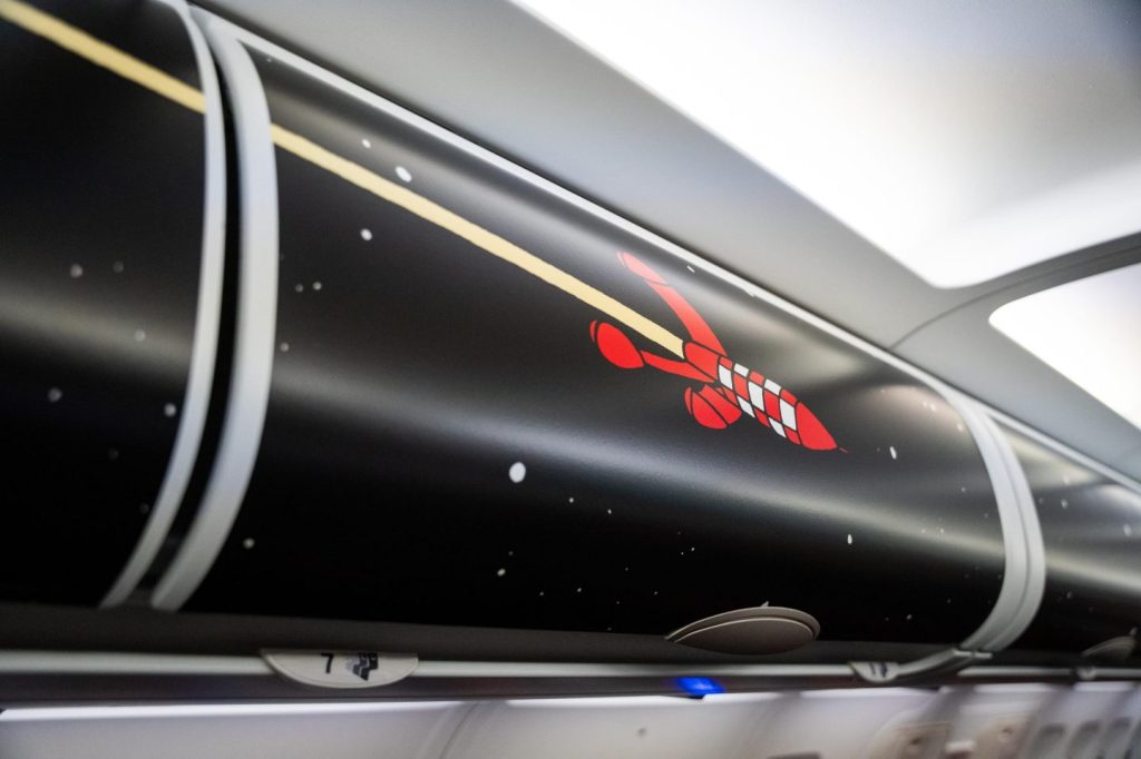 El tema espacial se ha extendido por todo el interior de la cabina. Los compartimentos superiores para el equipaje muestran visuales secuenciales similares a las viñetas de un cómic que narran el viaje de un cohete desde la Tierra, incluyendo encuentros con asteroides. El diseño también incorpora una cita manuscrita de Hergé: «A fuerza de creer en sus sueños, el hombre los convierte en realidad».