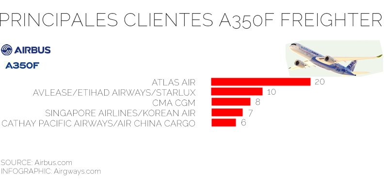 Atlas Air se ha convertido en el cliente más grande del mundo con una orden de veinte A350F (20), seguido por las compañías AvLease, Etihad Airways, Starlux con diez unidades (10), CMA CGM con ocho unidades (8), Singapore Airlines, Korean Air con siete unidades (7) y Cathay Pacific Airways y Air China Cargo con seis unidades (6), según fuentes de Airbus SE.