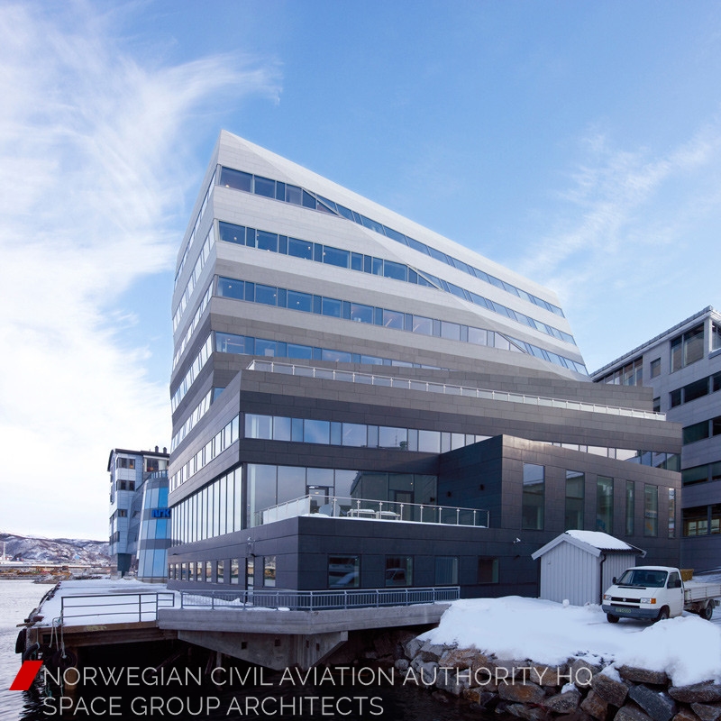 La construcción de una nueva sede para Luftfartstilsynet fue un desafío en la creación de un lugar para una organización desarraigada, trasplantada de Oslo a Bodø, y al hacerlo, la construcción de una nueva cultura de oficina. El sitio, una propiedad compacta frente al mar, está oculto de su dirección de la calle por el edificio NAV recientemente terminado. Aprovechando la diferencia de una historia entre el nivel clave y el nivel de la calle, el equipo perforó el edificio NAV con un túnel que se convierte en un puente programado (de recepción), conectando con el luftfartstilsynet independiente.